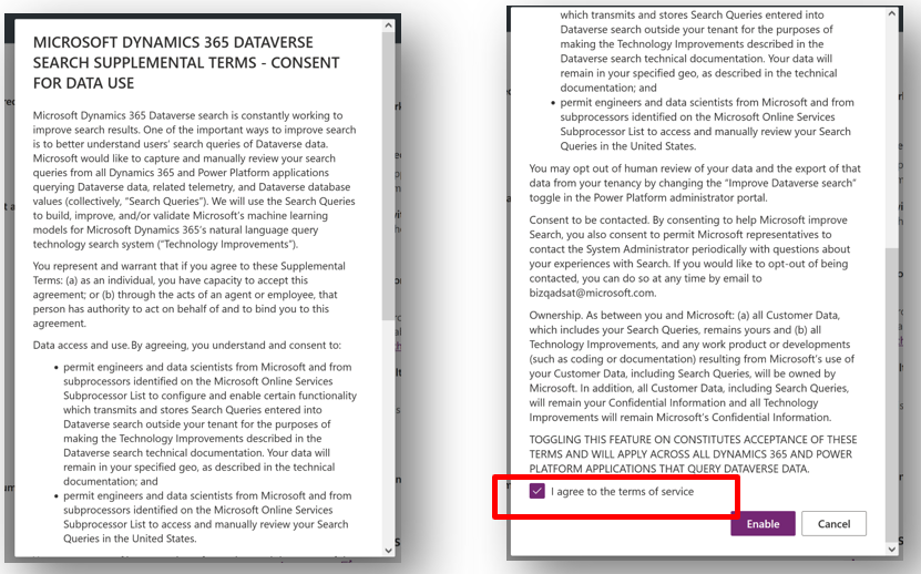 NOTE : Il faut accepter le consentement de Microsoft Dynamics 365 pour activer la fonctionnalité de Dataverse Search