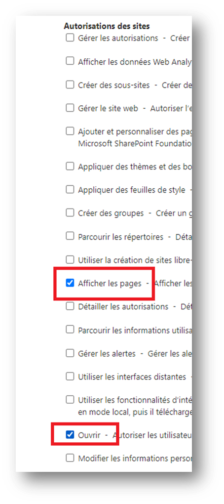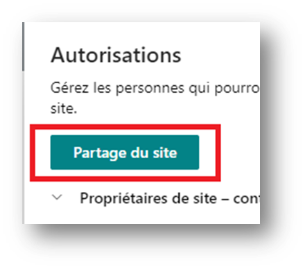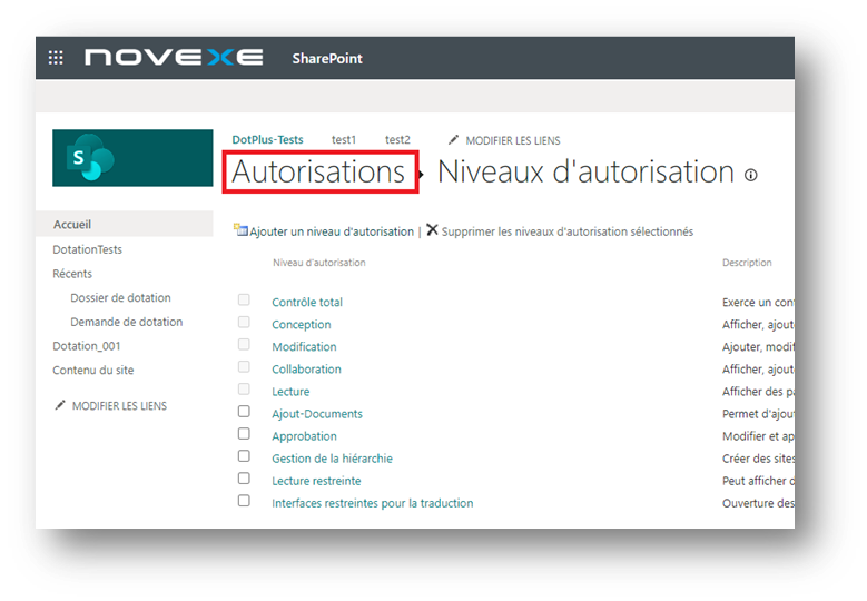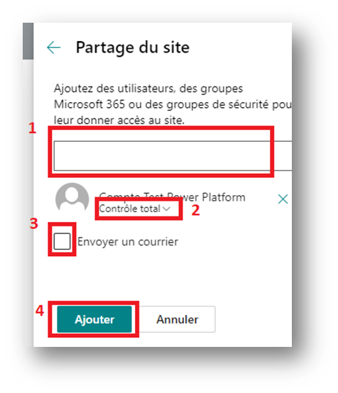 - Dans les autorisations du site, ajouter le compte de service et l’administrateur de l’environnement en contrôle total.