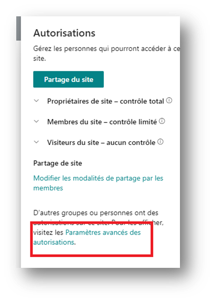 2. Dans les autorisations du site, choisir « Paramètres avancés des autorisations ».