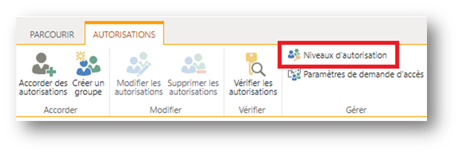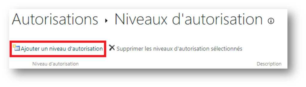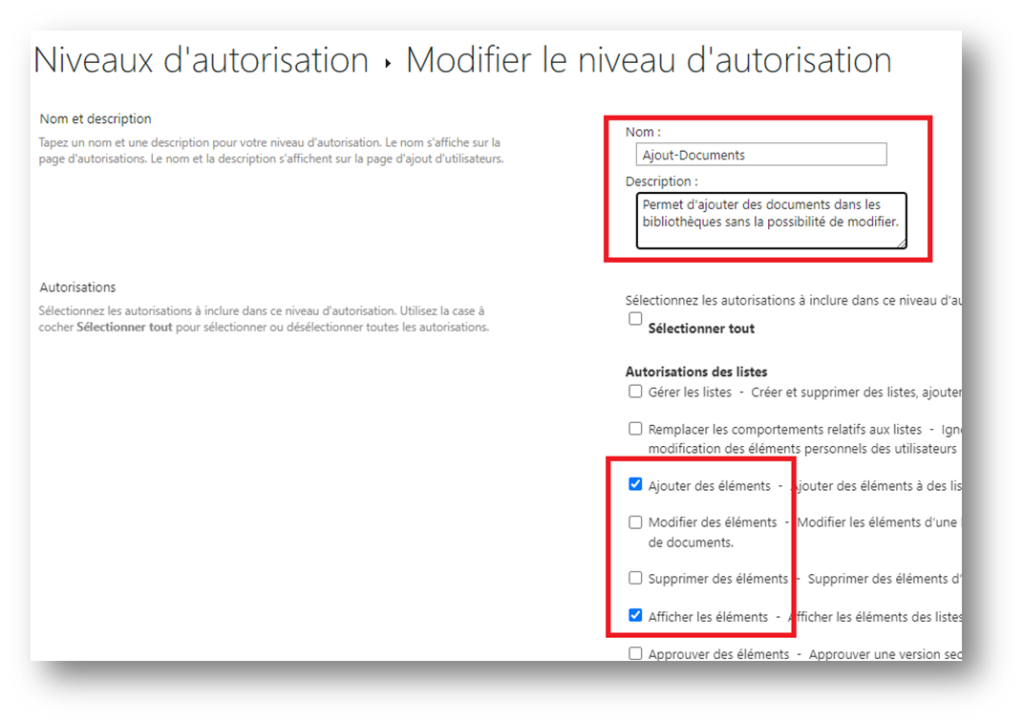 4. Ajouter un niveau d’autorisation « Ajout-Documents » avec les permissions suivantes.
