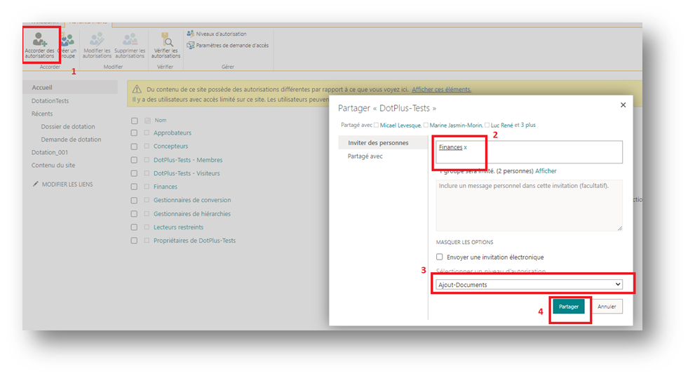 - Accéder au site SharePoint prévu pour l’hébergement des documents DOT+.