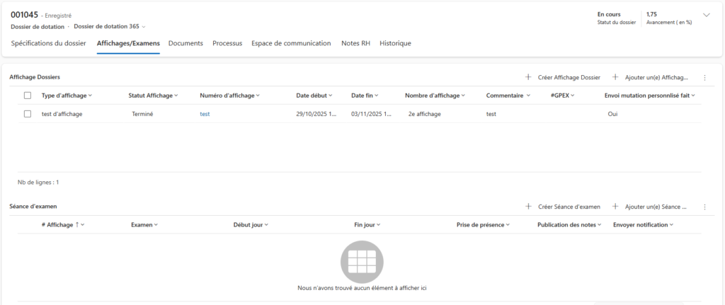 C’est ici que sont consignées les informations sur la diffusion du poste, le suivi des périodes d’affichage, ainsi que la planification des séances d’examen lorsque le processus de dotation le requiert.