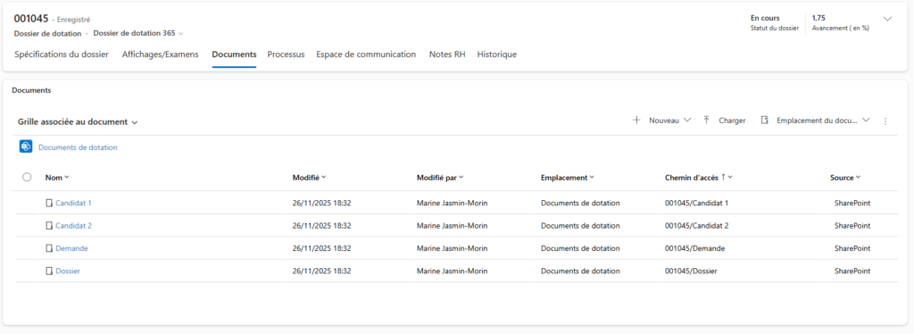 Chaque demande dispose automatiquement d’un espace documentaire SharePoint unique, créé dès son enregistrement, où les fichiers sont stockés et consultables par les utilisateurs autorisés.