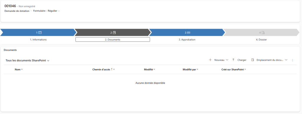 Si aucun document n’apparaît, c’est normal pour une nouvelle demande : l’espace SharePoint est créé après le premier enregistrement.