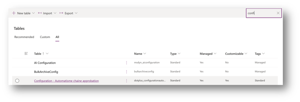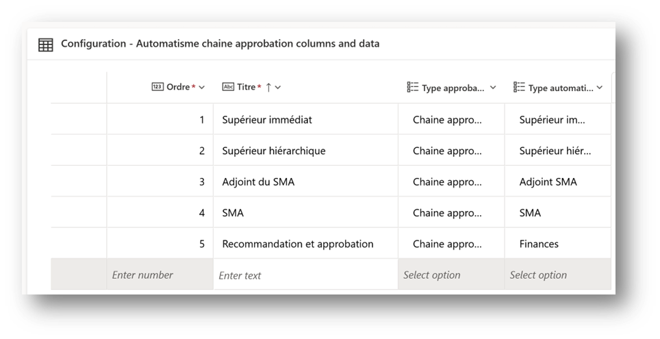 Table Configuration – Automatisme chaîne approbation