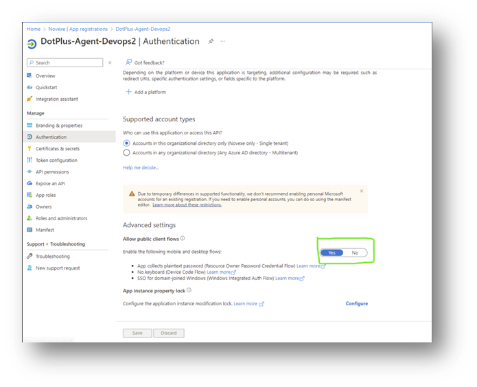NOTE : Il est important d’activer les permissions pour les flows publics en sélectionnant « Yes » dans l’interrupteur approprié dans la sous-section « Advanced settings » de « Authentication » dans Microsoft Azure :