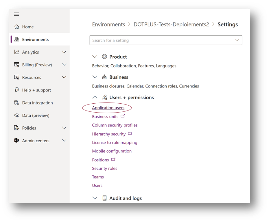 4. Choisissez « Application users » dans l’accordéon « Users + permissions »