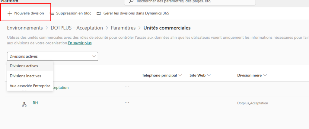 1. Cliquer sur le bouton + Nouvelle division (New Business Unit).