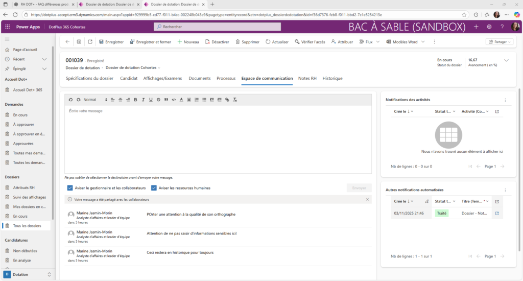 L’Espace de communication est un module intégré au dossier dans Dot+ qui sert à centraliser et historiser tous les échanges importants liés à un processus de dotation.