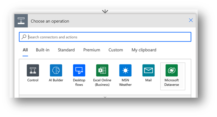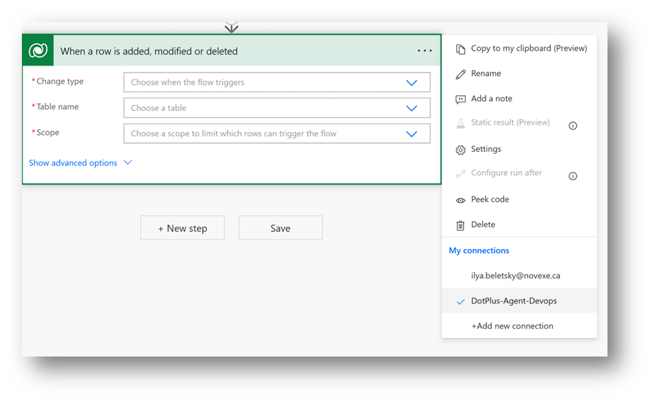 Cliquez sur le bouton « New step » et choisissez « Microsoft Dataverse »