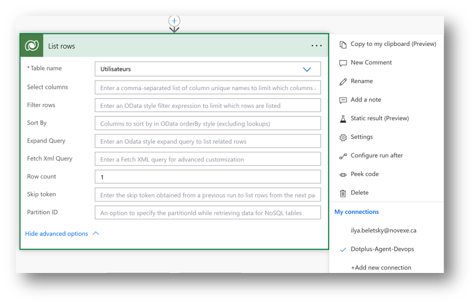 Ajoutez une action de Dataverse « List rows » en choisissant la table « Utilisateurs » et en mettant la valeur 1 dans l’input « Row count » :