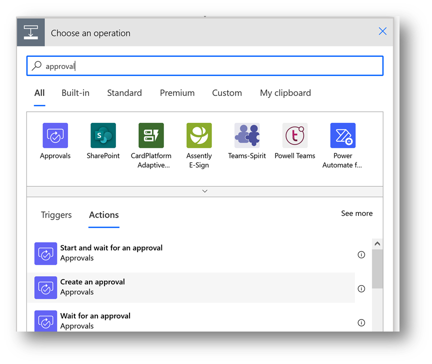 Cherchez la catégorie « Approvals » et choisissez l’action « Create an approval »