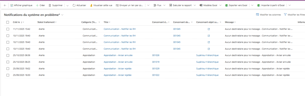 DOT+ génère automatiquement des notifications système lorsqu’un événement prévu (ex. une alerte, un courriel ou une communication) ne peut pas être envoyé ou rencontré une erreur.