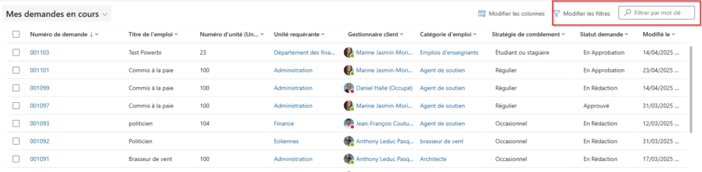 Par exemple: Si je cherche le mot coordonnatrice aux projets dans la vue des demandes »Toutes les demandes », j’obtiendrai seulement comme résultat les demandes en lien avec le mot coordonnatrice aux projets. Je ne verrai pas les dossiers s’il y en a.