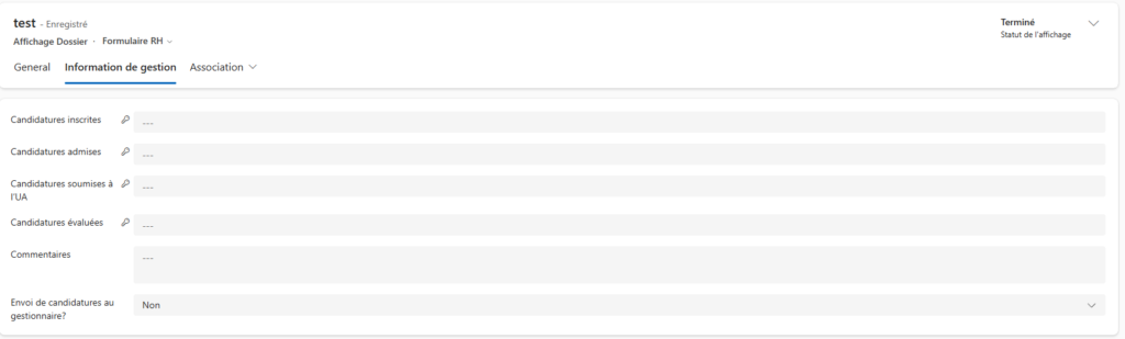Ces informations permettent à l’équipe RH de documenter le déroulement complet de l’affichage, d’assurer une traçabilité des candidatures et de fournir des indicateurs précis sur le nombre et l’état des postulants à chaque étape du processus.